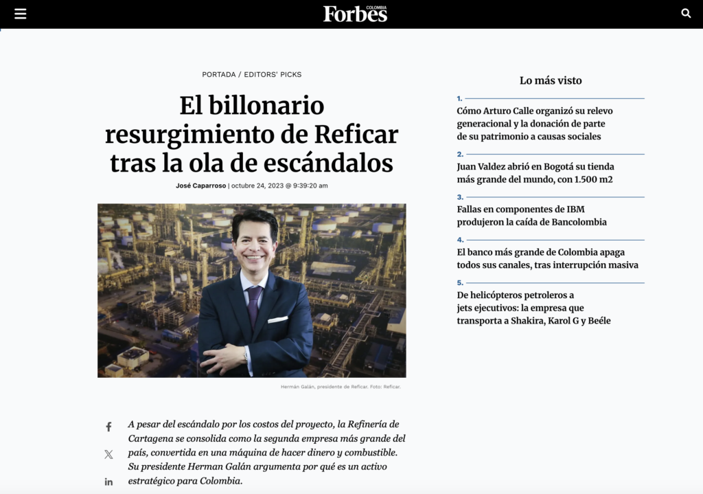 Construí y gestioné la narrativa institucional que posicionó a Reficar no como una empresa en escándalo, sino como un activo estratégico nacional vindicado. Para ello coordiné la vocería del presidente Herman Galán ante medios de alto impacto, logrando cobertura en Forbes Colombia y Bloomberg Línea, dos de los medios financieros más influyentes de América Latina.
