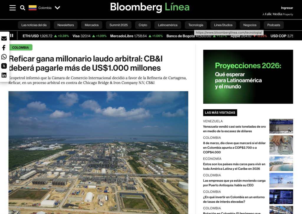 Lideré la estrategia de comunicación institucional de Refinería de Cartagena durante uno de los procesos más complejos de su historia: el arbitraje internacional contra CB&I/McDermott ante la Cámara de Comercio Internacional, que resultó en un laudo favorable de US$1.000 millones.